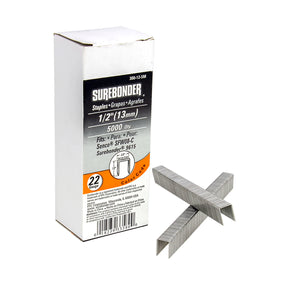 1/2" leg length upholstery staples with a 3/8" narrow crown are ideal for deeper fastening in upholstery, fabric work, and furniture repair. Made from 22 gauge steel, they deliver strong holding power while minimizing damage to delicate materials. Compatible with most upholstery staple guns that accept 22 gauge, 3/8" crown staples. Includes 5,000 staples per box for high-volume use.