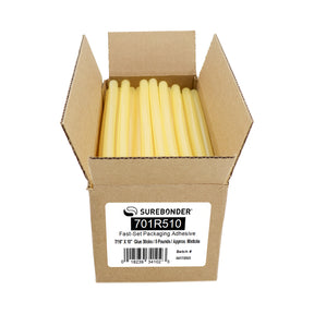 Surebonder 701R510 are standard full-size (7/16", 1/2", 0.43") diameter by 10" long fast set hot glue sticks. These high-temperature glue sticks will bond with most porous materials such as; cardboard, paper board, wood, foam, and cloth. They work great for sealing corrugated cartons and for carpet back seaming as they resist cracking at low temperatures. This product is made in the U.S.A. with global materials and is ASTM D-4236 Compliant. (1) 5 lb box, approx. 90 glue sticks.