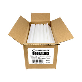 Surebonder 925R510 Full Size (7/16", 1/2", 0.43") Diameter by 10" Long Acrylic Hot Glue Sticks are clear in color and come in a 5 lb box. Surebonder's 925 Hot Melt Adhesive is specially formulated and provides a flexible yet strong bond in just 60 seconds after application. Offers a superior bond to many substrates such as; wood, plastic, metal, ceramic, vinyl, leather, concrete, stone, glass, tile, fabric, and more. Great for household repairs, concrete, tile repair, vinyl cove, installing carpet tack strips, ideal for bonding hard-to-bond-to surfaces, and much more. This product is made in the U.S.A. with global materials. (1) 5 lb box, approx. 90 glue sticks. ASTM D-4236 Compliant.