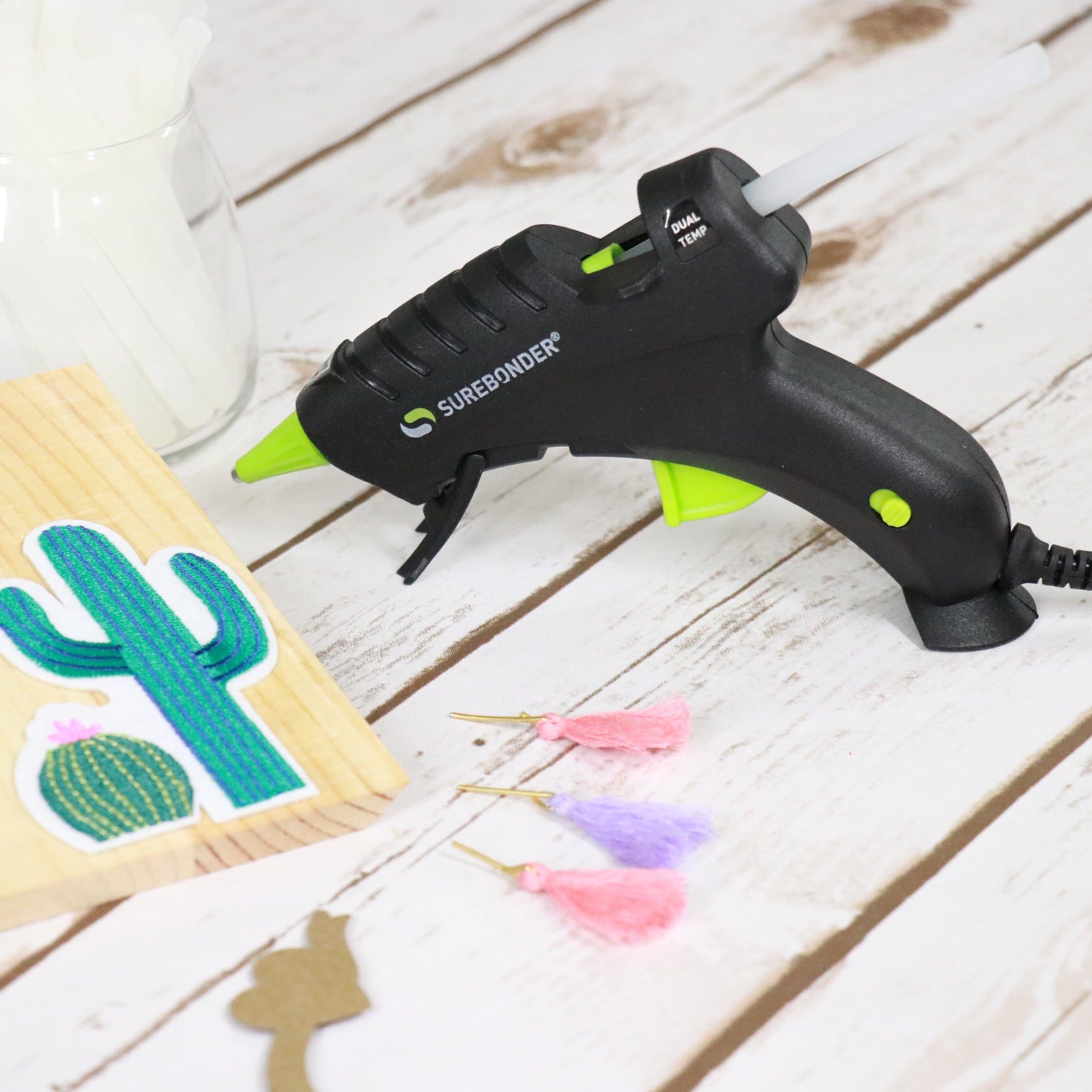 Use the low-temperature setting for heat-sensitive projects like lace, fabric, ribbon, floral foam, and lightweight craft materials. Flip to the high-temperature setting when you need a stronger bond on tougher surfaces such as wood, metal, ceramics, magnets, plastics, and other non-porous materials.